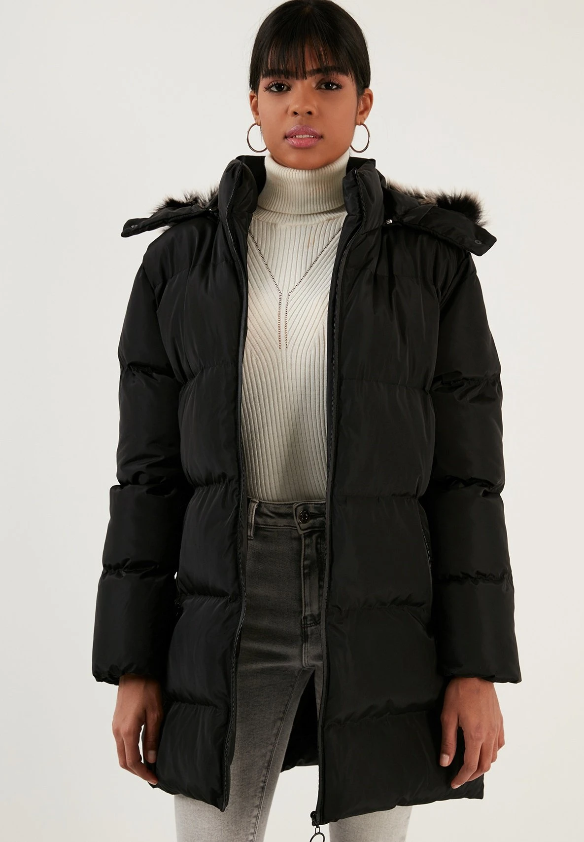 | Details capuchon | Gevoerd, afneembare imitatiebontkraag |